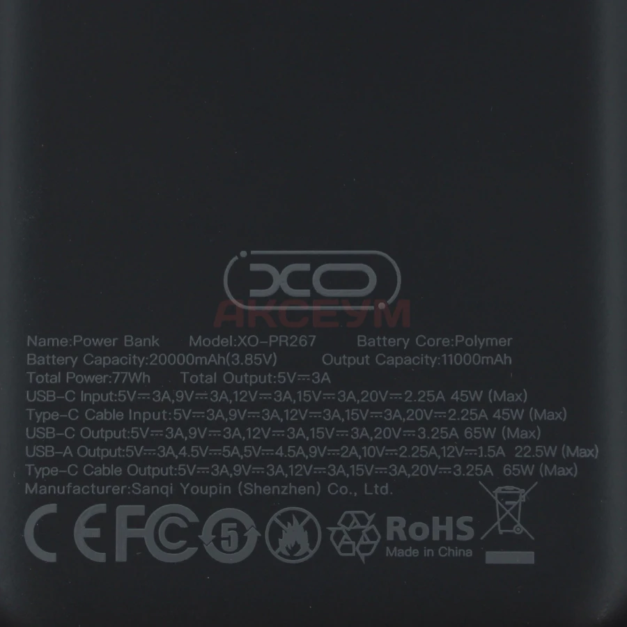 Внешний аккумулятор XO PR267 20000 mAh (65W/QC3.0/PD/2Type-C/LCD) серый